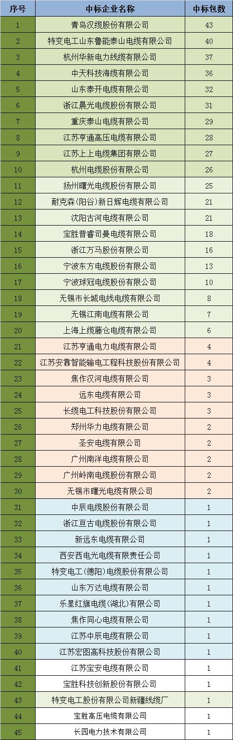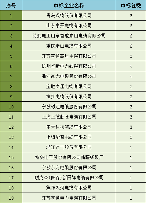 前十家电力电缆企业中标包数占总数的64%,分别是青岛汉缆股份有限公司、特变电工od(中国)鲁能泰山电缆有限公司、杭州华新电力线缆有限公司、中天科技海缆有限公司、od(中国)泰开电缆有限公司、浙江晨光电缆股份有限公司、重庆泰山电缆有限公司、江苏亨通高压电缆有限公司、江苏上上电缆集团有限公司、杭州电缆股份有限公司。